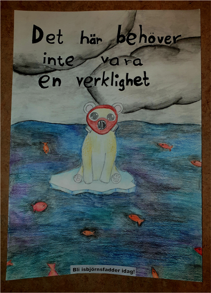 ” En ensam isbjörn med gasmask på ett isflak – en genialisk idé som berör och får oss att haja till. Med en slagkraftig rubrik och konstnärligt genomförande fångar affischen flera av de stora miljöproblemen.